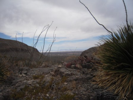 The cottonwoods that gave Alamo Cañon its name are long gone, and whatever water once flowed through the canyon is now sucked up to slake the thirst of the growing town of Alamogordo. Although the FS map shows the trail following the bed of the canyon, the path actually crosses a broad alluvial fan at the canyon’s mouth before climbing over the low bench separating Alamo and Deadman Canyon and up over the shoulder of “The Roundup Ground” ridge.