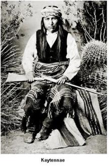 Kaywaykla, his foster son, recounted one incident in which Kaytennae was lying in wait on a ledge above a desert waterhole when a group of Apache scouts approached. (Usually traveling on foot, the scouts could easily outdistance the cavalry they were guiding and so were typically ranging far ahead of the troops.) Enraged at the sight of men he knew, Kaytennnae jumped to his feet and yelled down at the scouts, abusing them as cowards and daring them to come up into the rocks. “Come up here we’ll give you metal, more then you want. I have sharp metal for your treacherous hearts! Brave warriors who fight their people deserve reward. We’ll give it!”