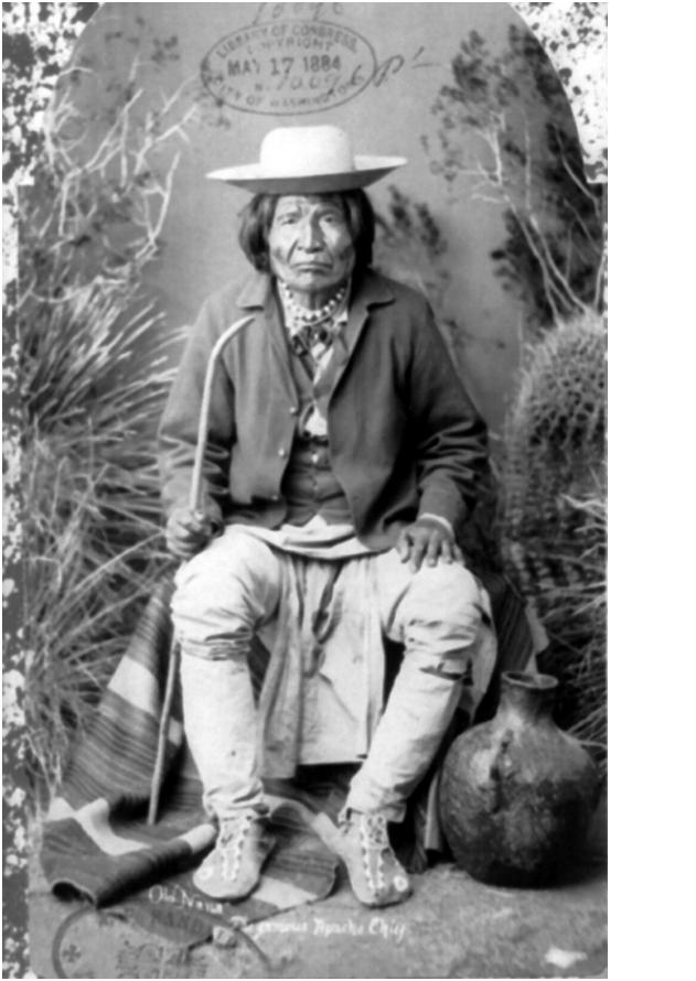 No Apache called him “Broken Foot” (a nickname that may be better translated as “Lame”) to his face. He was no man to be defined by or even acknowledge his infirmities, and he bore the pain of his bad leg stoically, as he did the rheumatism that afflicted his later years. “He asked no odds because of either age or lameness,” said his greatnephew James Kaywaykla, who as a little boy called the old man “grandfather.” His other Apache name might be rendered in English as “Grumpy” or “Bad-tempered.” He may have been a lovable grandfather to those around him, but in his best-known photograph he looks more like the “Hey, you kids! Get off my lawn!” type curmudgeon. In his case, the trespassing “kids” were the hairy, pale-eyed gabachos who suddenly showed up and started bossing people around like they owned the place when Nana was already approaching middle age.